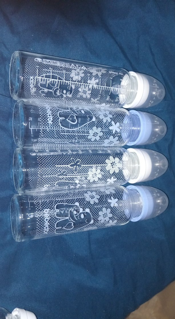 Mavi kapaklı, ısıya dayanıklı ölçü işaretli ve desenli dört renkli bebek biberonu seti. Sıvı miktarını kolayca takip etmeye uygundur.