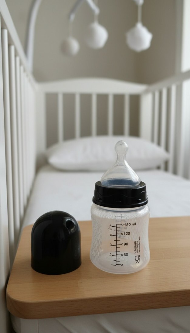 150 ml kapasiteli beyaz bebek biberonu, gri ölçü işaretleri ve siyah kapaklı. Yumuşak emzikli besleme ürünü.