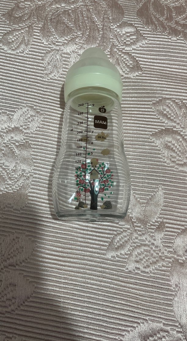Yumuşak emzikli, 260 ml ölçü işaretli bebek biberonu. Üzerinde ağaç deseni bulunmaktadır.