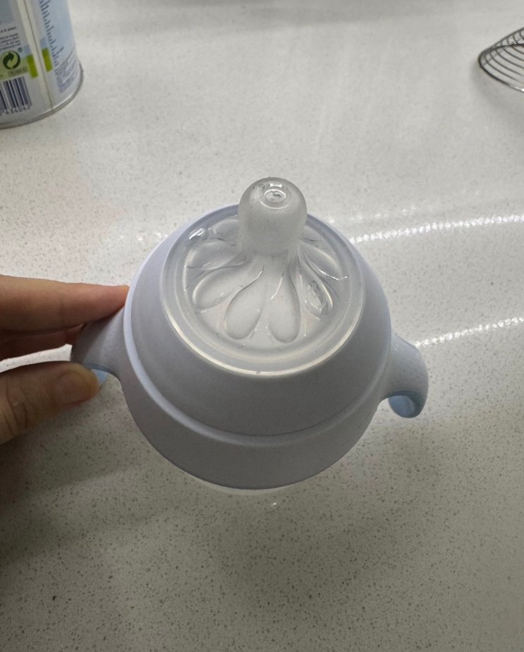 Beyaz ve gri renkte, yumuşak silikon emziği ve tutma kulpları olan bebek biberonu. Avent hiç kullanılmadı