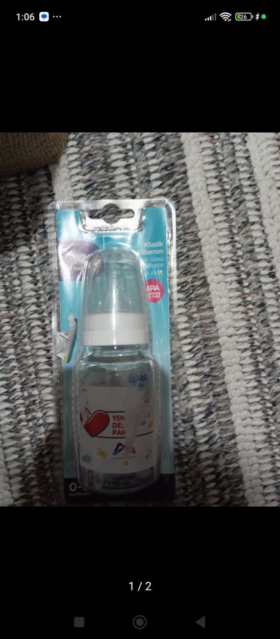 Camdan yapılmış, pastel beyaz renkte bebek biberonu. BPA içermez, yenidoğanlar için uygundur.
