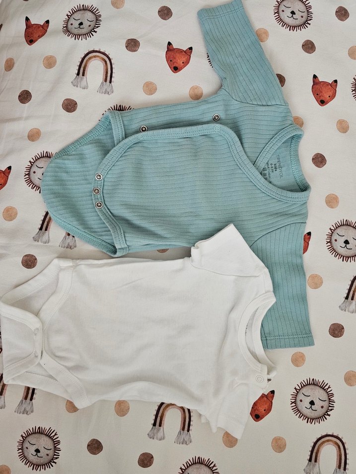 Pamuklu, kısa kollu, beyaz renkte yarım kollu, yeşil renkli Uzun Kollu bebek body. Kolay giydirme için düğmeli ve yuvarlak yakalıdır. Rahat ve sade tasarım. Beyaz hiç kullanılmadı. Yeşil olan 2 kez giyildi tertemiz