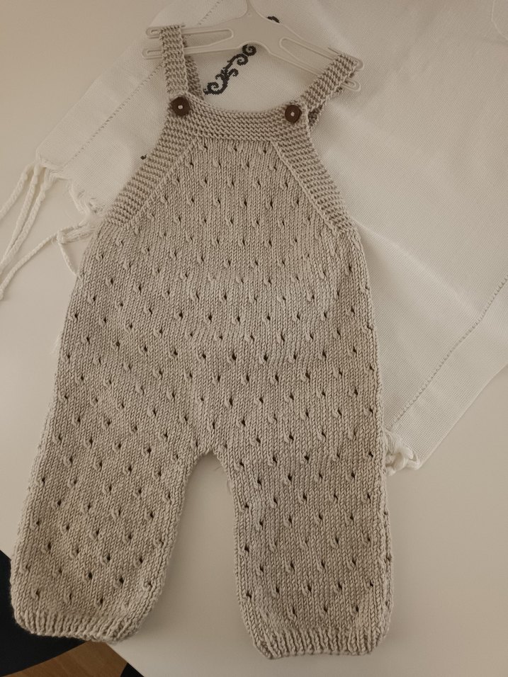 Bohem tarzda, askılı, bol kesim örgü bebek salopet. Yumuşak ve rahat örgü kumaştan yapılmıştır.
