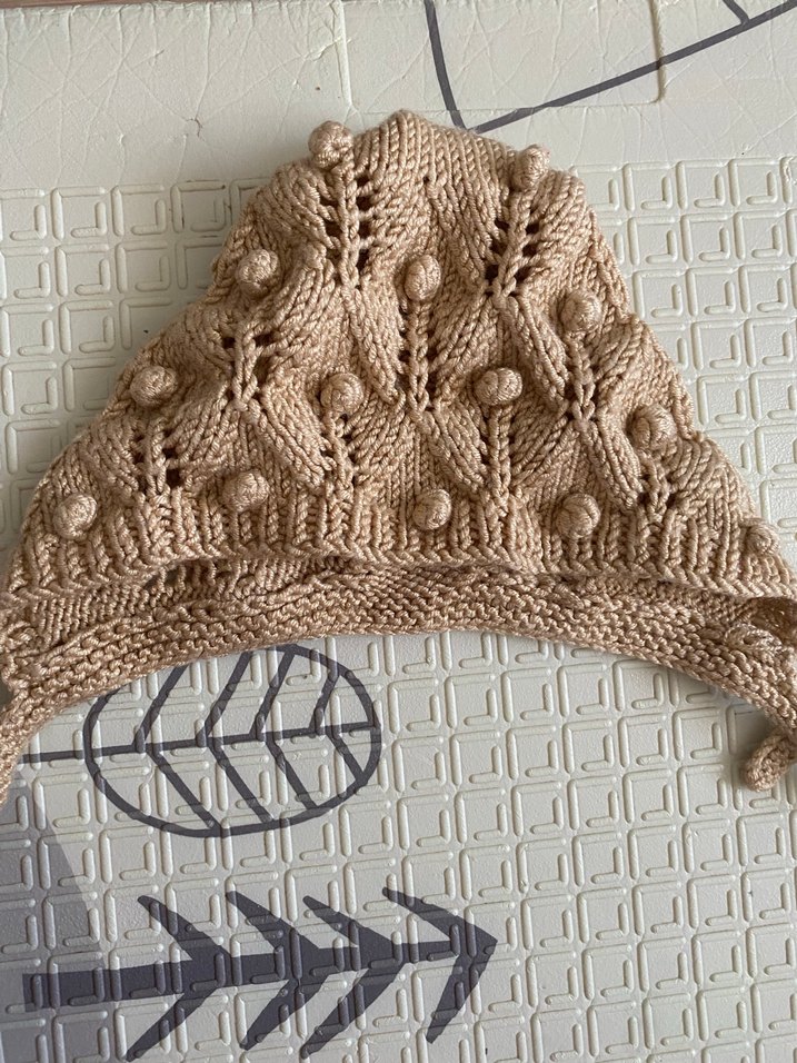 Bej renkli, dokulu örgü desenlere sahip rahat bohem tarzında çocuk bere.