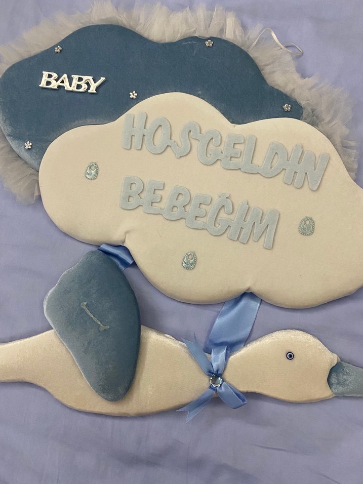 Pastel mavi bulut ve kuğu figürlü, hoş geldin yazılı kapı süsü