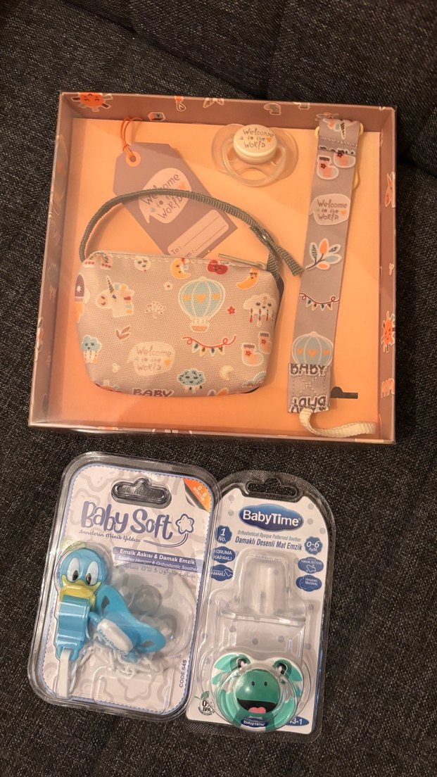 Gri renkte, desenli bebek çantası ve BabyTime ile BabySoft markalarından biberon klipsi, emzik ve kayış aksesuarları içerir.