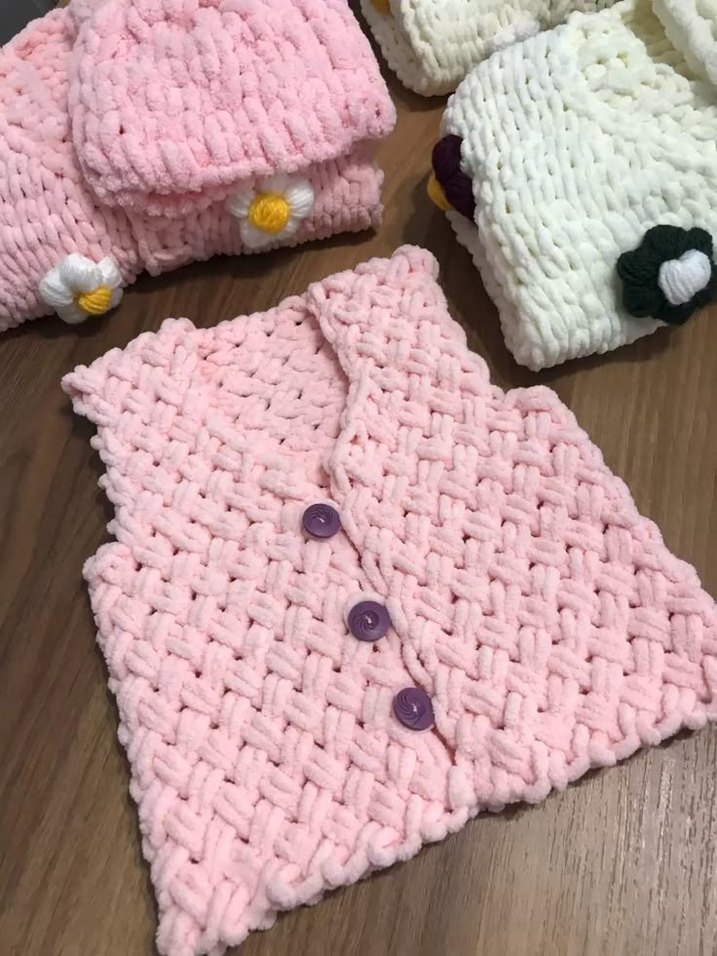 Pastel pembe renkte, bohem tarzda, örme kız yeleği. kolsuz ve fitted kesim. Ahşap düğmelerle detaylandırılmış. İstenilen renkte ve ölçüde yapılır
