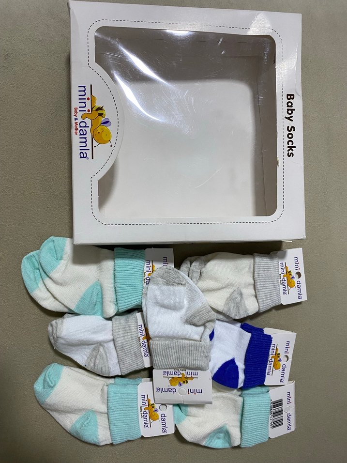 Mini Damla markasına ait beyaz ve gri renklerde, baskılı ve yumuşak tüylü bebek çorapları seti. Küçük ayaklar için rahat ve sıcak tutar.