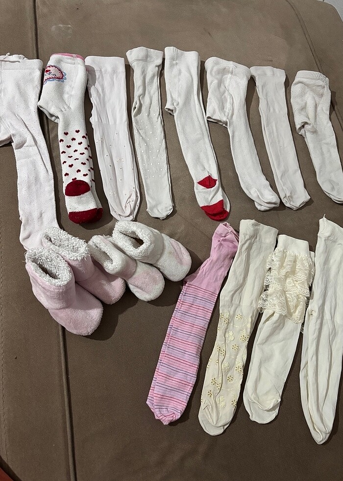 0-6, 6-9 ay. Hepsinin fiyatı. İyi durumdalar. Alttaki 3 beyaz çorabın desenli olan ve tütülü olan hiç giyilmedi ama üçünde de kaçma var. Panduflarda küçük leke var