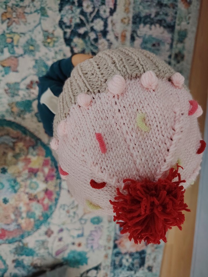 Bebekler için örgü bere, pastel tonlarda ve kırmızı ponpon detaylı, rahat ve bohem tarzda.