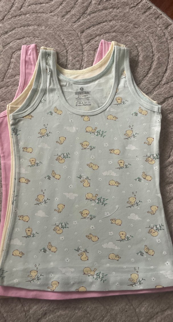 Pastel renklerde, baskılı desenli 3'lü çocuk atlet seti. Bej renkli atlet, sevimli civciv desenine sahip, yumuşak kumaştan yapılmıştır.