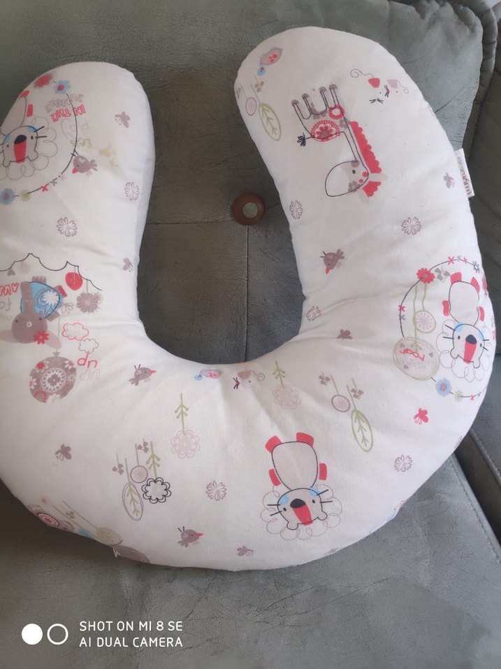 Bebek desenli, pastel gri renkte hamilelik ve emzirme yastığıdır. Rahat destek sağlar.