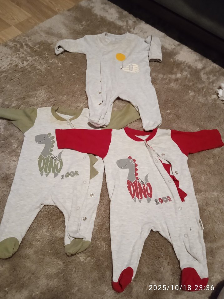 Yumuşak gri tonlarda polar kumaştan yapılmış üç bebek tulumu seti. İki tulumda dinazor baskısı, biri küçük balon deseni bulunur. Kolay giydirme için çıtçıtlıdır. kullanımı çok rahat