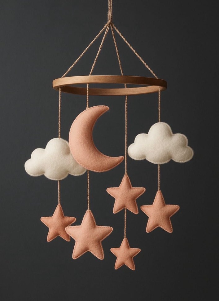 Bej renkte, nakışlı pastel bulutlar, yıldızlar ve ay figürlerinden oluşan yumuşak kumaş bebek oyun sarkıtı. İstenilen renkte figürde yapılır. Sipariş üzerine yapılır.