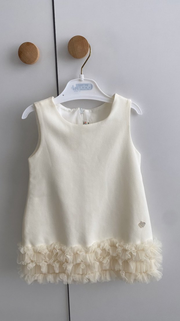 Kolsuz, yuvarlak yakalı ve bol kesim beyaz kız çocuk elbisesi, etek kısmında zarif fırfır detayları bulunur. Yumuşak ve sıcak kumaştan üretilmiştir. Bir kere kullanıldı göründüğü gibi kusursuz