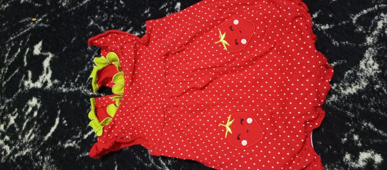 Kız çocuk elbisesi, kısa kollu ve V yakalıdır. Sentetik kumaştan, kırmızı renkte, renkli nakışlı fırfır detaylarına sahiptir, trend sokak stiline uygundur.