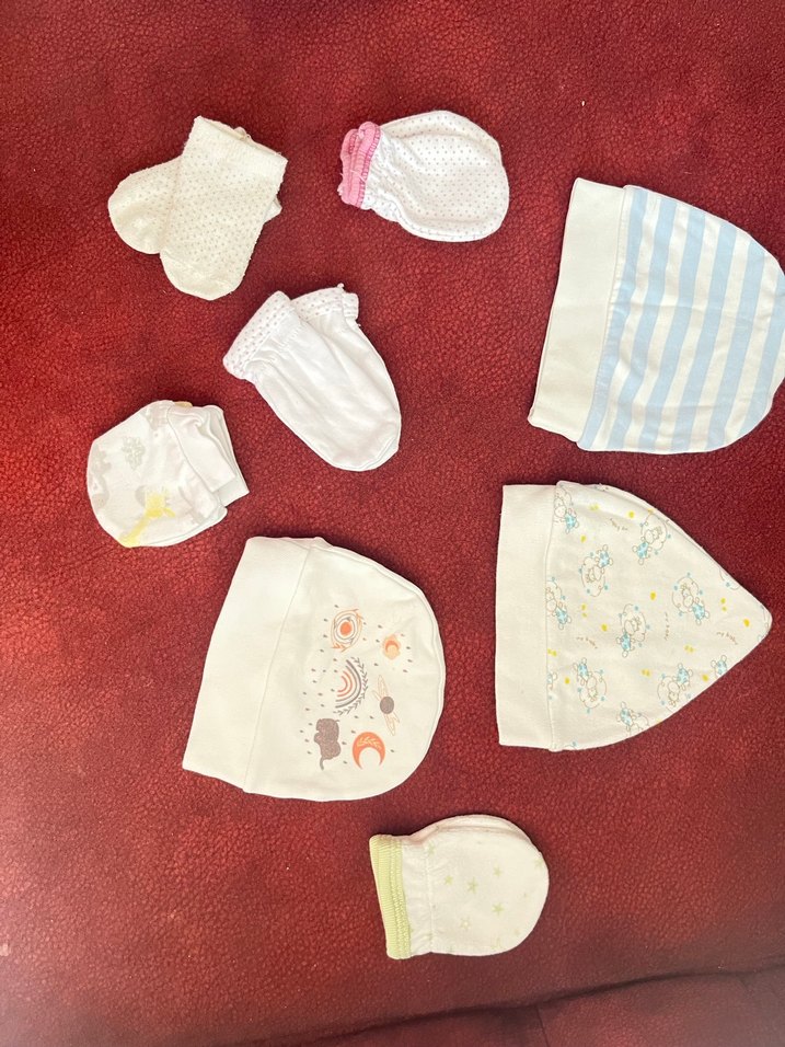 Nakışlı detaylara sahip beyaz bebek eldivenleri ve şapkaları, yumuşak tekstilden üretilmiştir. Rahatlık ve şıklık için çeşitli açık renk desenler içerir.