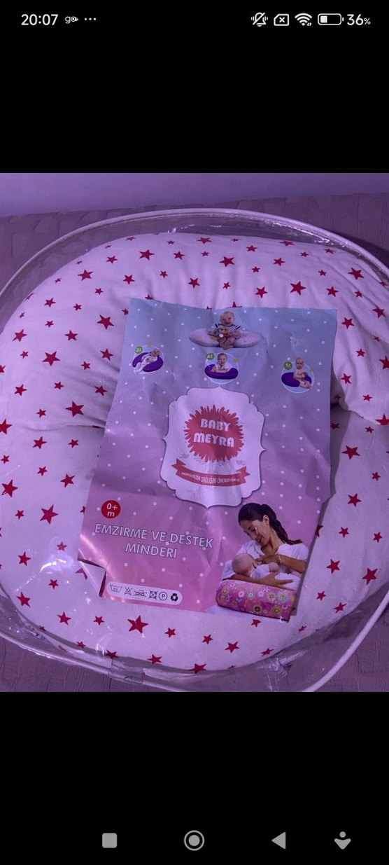 Pembe yıldız desenli, yumuşak malzemeden yapılmış emzirme ve destek minderi, rahat emzirme için tasarlanmıştır.