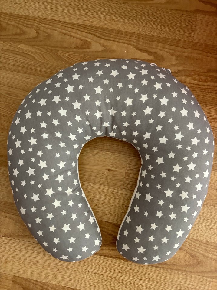 Gri renkli, yıldız desenli hamilelik ve emzirme yastığı, rahat destek sağlar. Hiç kullanılmadı