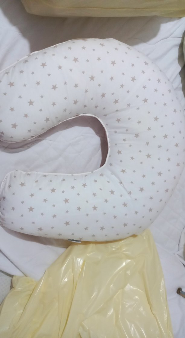 Beyaz zemin üzerinde pastel tonlarda yıldız desenli bebek emzirme ve hamilelik yastığı, rahat destek sağlar.