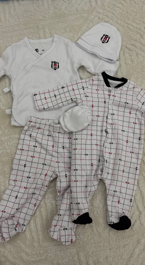 Bu bebek erkek kıyafet seti, beyaz uzun kollu yuvarlak yaka üst, şapka, desenli pantolon ve çoraplı tulumdan oluşur. Yumuşak ve sıcak kumaştan üretilmiştir, sokak stili rahat şıklık sunar. Hastane çıkışı olarak bile kullanılabilir. Temmuzda doğduğundan giyilmedi. Yıkandı kaldırıldı.