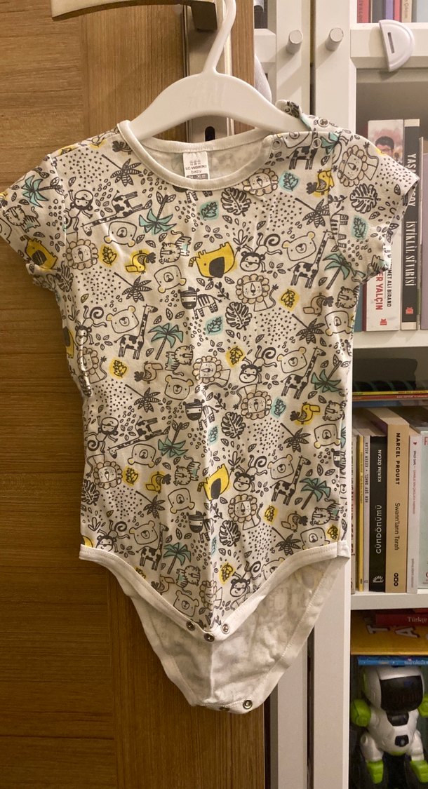 Kısa kollu, boğazlı ve düğmeli bebek erkek bodysi, yumuşak tekstil kumaş üzerinde eğlenceli desenlerle gri ve beyaz tonlarında.