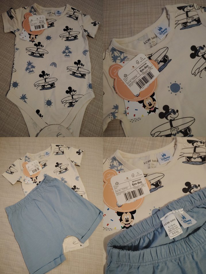 Beyaz kısa kollu pamuklu body, Mickey Mouse baskılı, pastel mavi şort ile birlikte. Yuvarlak yaka, normcore tarzda bebek erkek takım.