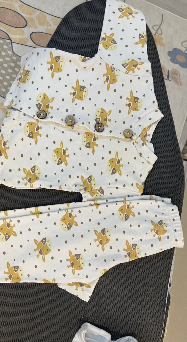 Bebek erkek takımı kısa kollu, düğmeli V yakalı ve baskılı desenlidir. Beyaz ve gri tonlarda, yumuşak sentetik kumaştan üretilmiştir.