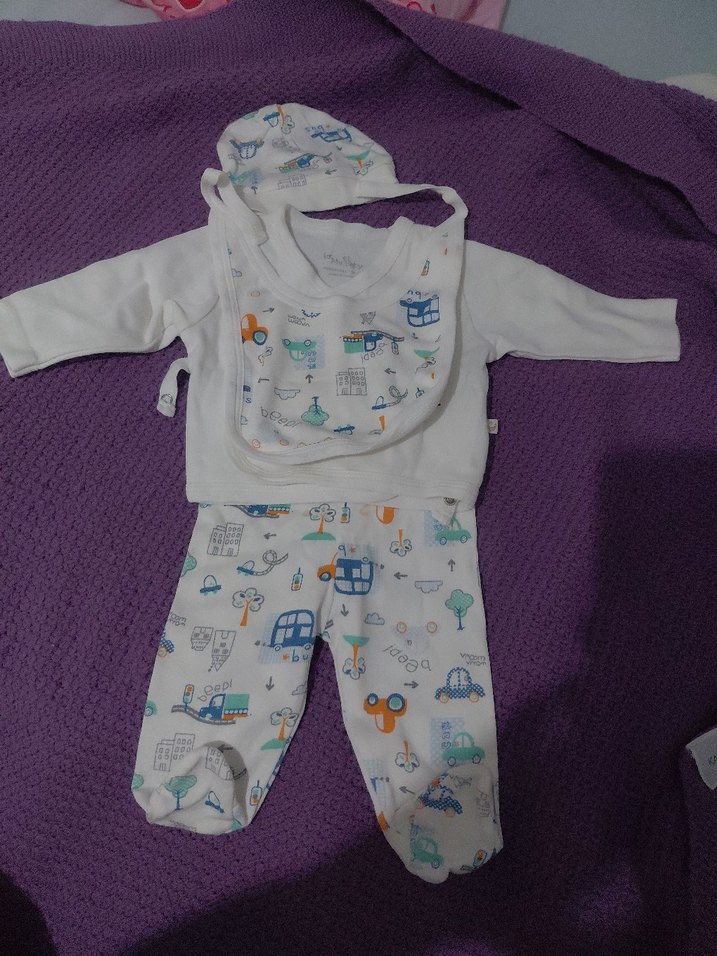 Bebek erkek için baskılı, uzun kollu, bisiklet yaka, örgü detaylı üst, pantolon, önlük ve şapka içeren sentetik kumaş set. Pastel renklerde.