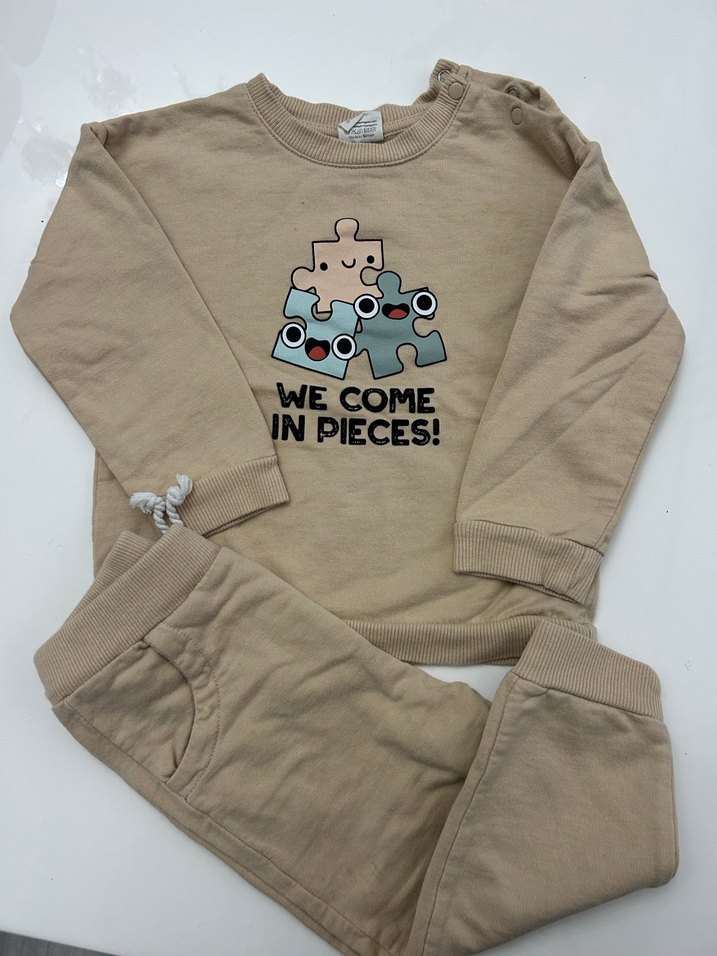Uzun kollu, bisiklet yaka ve örme dokulu bej renkli bebek erkek takım. Üzerinde eğlenceli puzzle baskısı ve cepli pantolon bulunur.