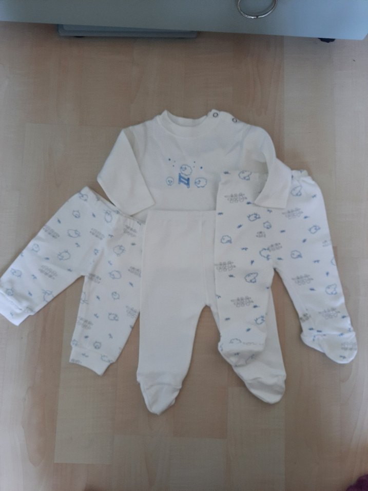 Bebek erkek için yumuşak ve pamuklu kumaştan yapılmış, uzun kollu, bisiklet yaka üst ve üç adet pantolon içeren beyaz tonlarında takım. Rahat ve sade tasarım sunar.