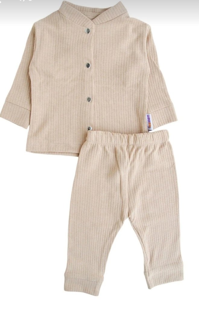 Beyaz renkte, düğmeli uzun kollu üst ve eşofman altından oluşan pamuklu bebek erkek hastane takımı.