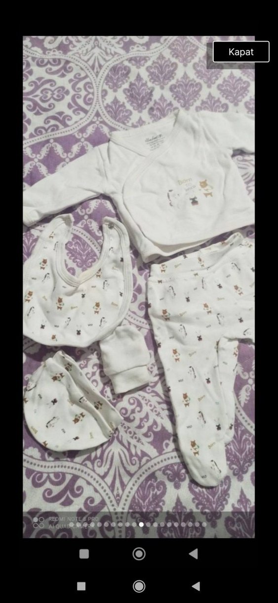 Beyaz, hafif renk tonunda, hayvan desenli uzun kollu üst, pantolon ve iki önlükten oluşan bebek erkek kıyafet seti.
