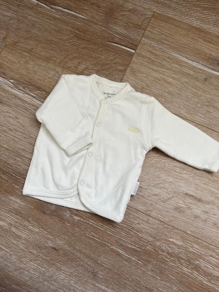 Bebek erkek için uzun kollu, düğmeli ve yumuşak, sıcak kumaştan yapılmış pastel beyaz hastane kıyafeti. Desensiz sade tasarım içerir.