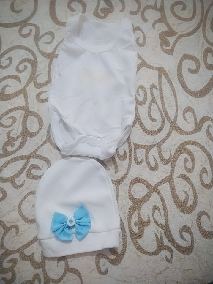 Yumuşak sentetik kumaştan, balıkçı yaka ve kolsuz beyaz bebek erkek takım. Şapkasında mavi fiyonk bulunur. Sokak stili için uygun.