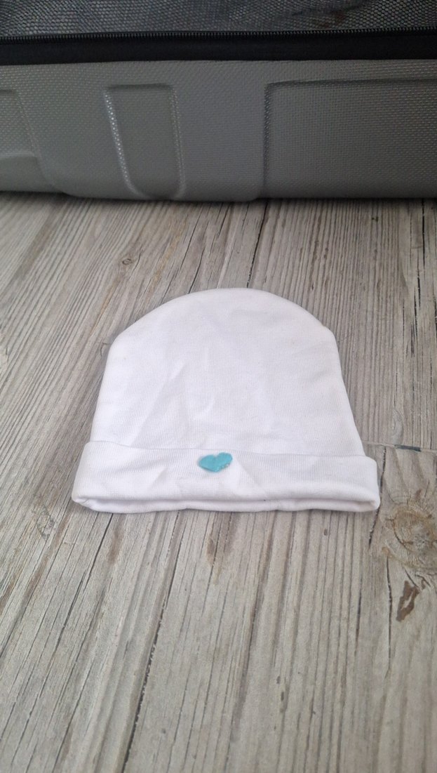 Yumuşak kumaştan yapılmış beyaz bebek erkek hastane şapkası, küçük mavi kalp detayı ile. Yenidoğanlar için nazik konfor sağlar.