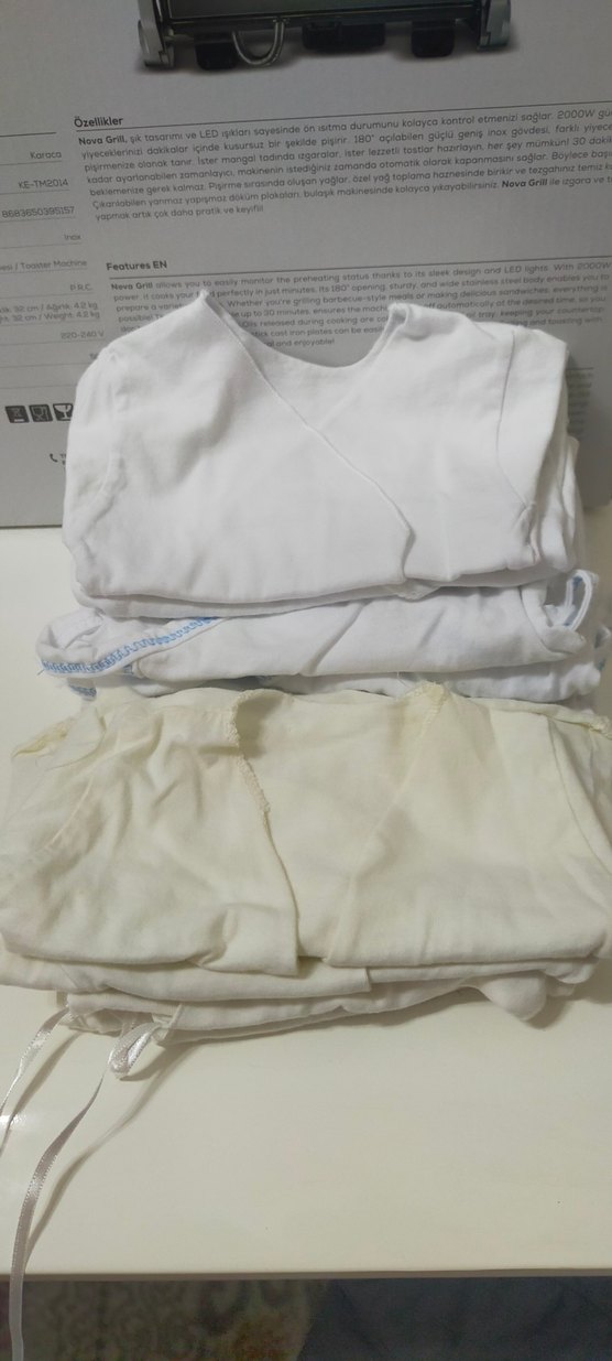 Bebek erkek için beyaz keten kumaştan, kısa kollu, desensiz hastane kıyafeti. Rahat ve sade bir tarz sunar. 10 lu