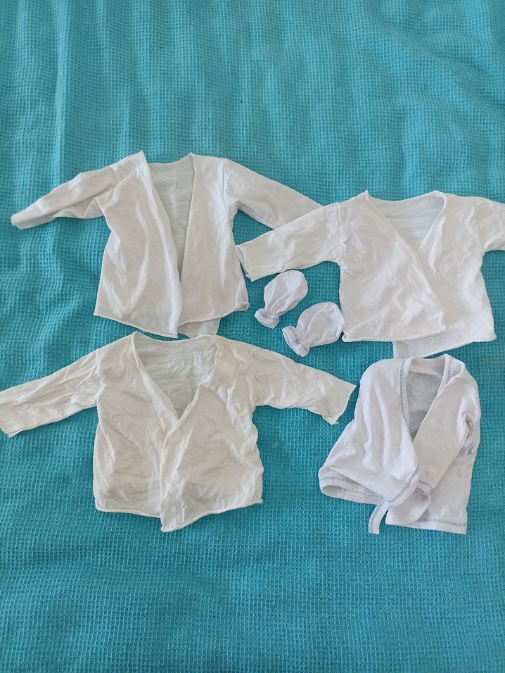 Uzun kollu beyaz keten bebek erkek hastane kıyafeti, rahat ve sade tasarıma sahiptir. Eldiven ve kuşaklı ceket içerir. temiz