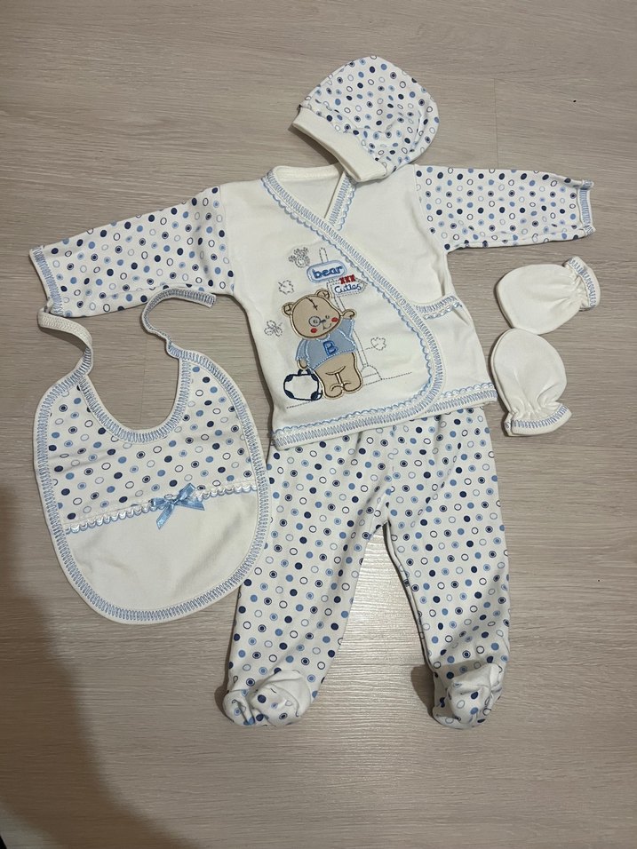 Nakışlı ayıcık detaylı, uzun kollu üst, puantiyeli şapka, eldiven, önlük ve uyumlu pantolondan oluşan hafif, yumuşak bebek hastane çıkışı. Hiç kullanılmadı.