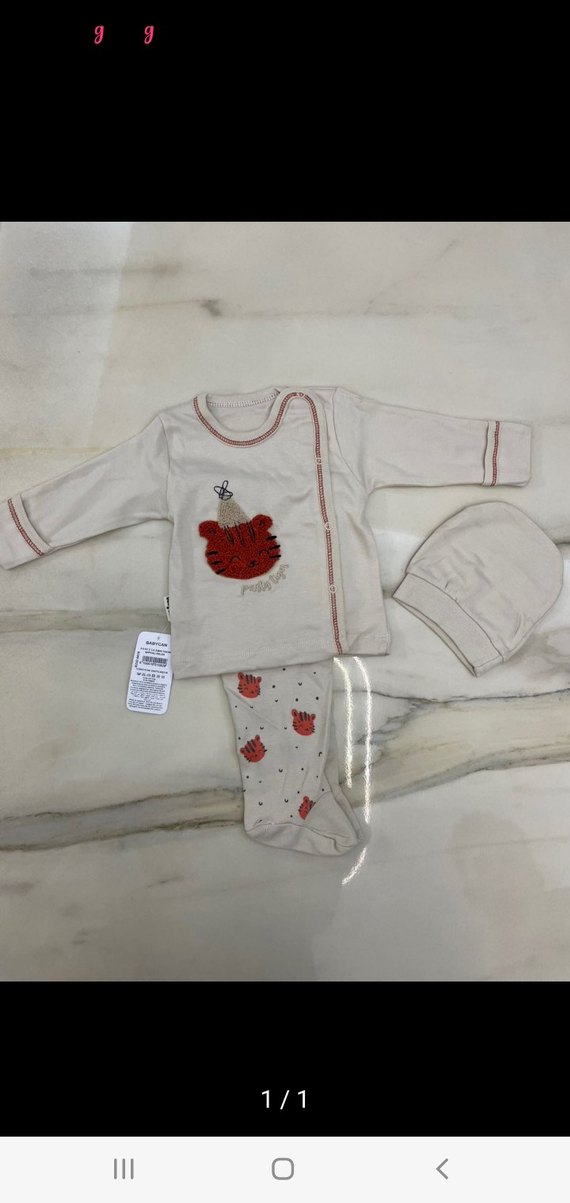 Beyaz uzun kollu örme pamuklu üst, baskılı tiger desenli pantolon ve şapka içeren bebek erkek takım. Street wear tarzında.