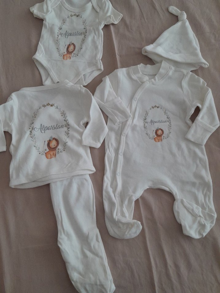 Alparslan yazılı yeni doğan set.Pamuklu beyaz bohem tarzda, uzun kollu body, pantolon, üst, tulum ve şapka seti. Baskılı aslan deseni ve yuvarlak yaka ile rahat ve şık. yakalığında süt lekesi vardır diğerleri temizdir