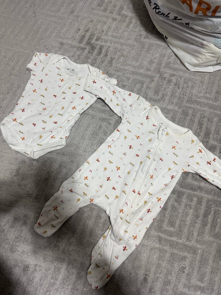 Yumuşak pamuklu, uzun kollu bebek erkek hastane kıyafeti, beyaz ve gri tonlarda örme dokulu ve hafif desenlidir.