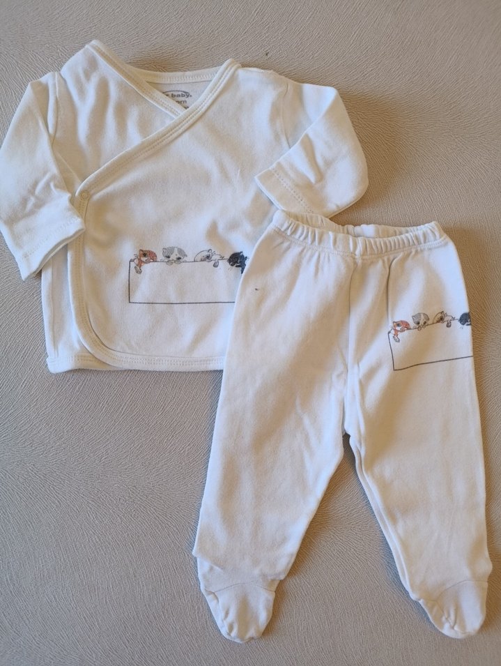 Pamuklu, beyaz uzun kollu üst ve ayaklı pantolon içeren bebek hastane kıyafeti.