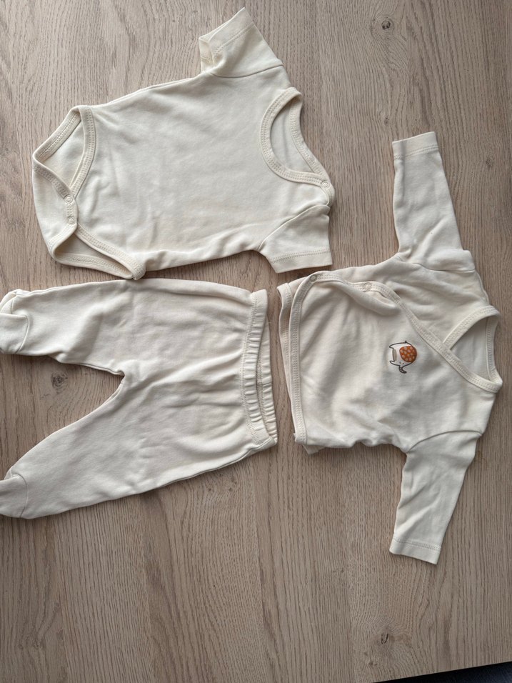 Yumuşak pamuktan yapılmış, açık beyaz bebek erkek takım. Uzun kollu, yuvarlak yakalı, sade tasarımlı üst, zıbın ve pantolon içerir.