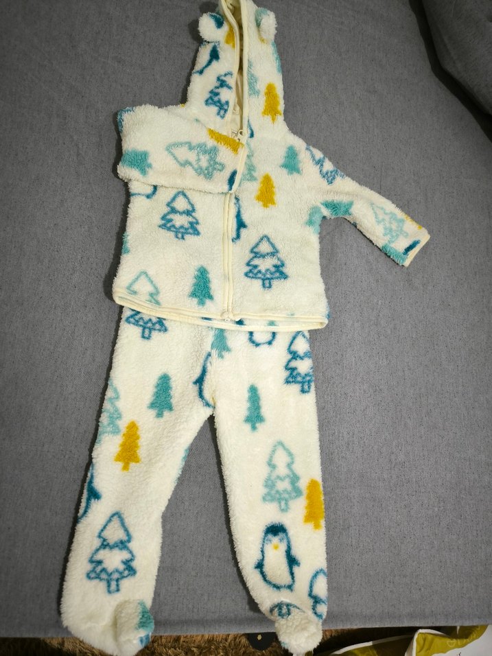 Yumuşak ve sıcak beyaz polar bebek tulumu, pastel ağaç ve penguen desenleriyle. Kulaklı kapüşon ve kolay giyilen ön fermuarlı.