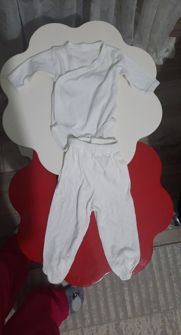 Bebek erkek için beyaz, uzun kollu, yumuşak ve sıcak kumaştan yapılmış hastane kıyafeti. Yanı açık üst ve ayaklı pantolon içerir.Kendim takım yaptım üst kullanılmadı altta 1 kere anca kullanıldı beyaz takım sorunsuzdur
