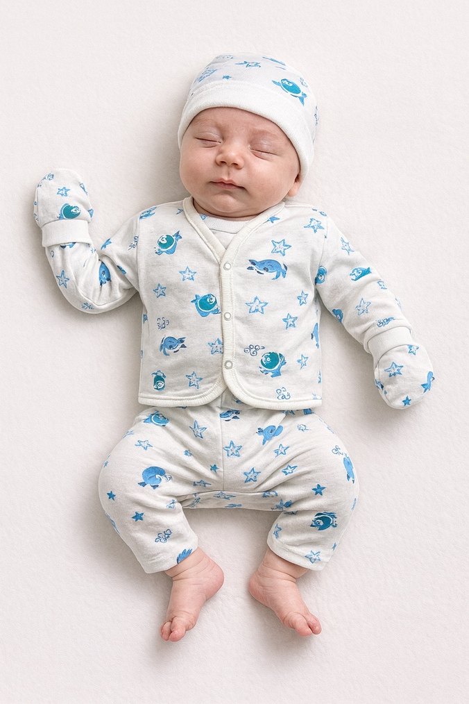 Yumuşak ve sıcak bebek erkek takım, uzun kollu ve boğazlıdır. Beyaz takımda düğmeli detaylar ve pastel mavi yıldız ve gezegen deseni bulunur.