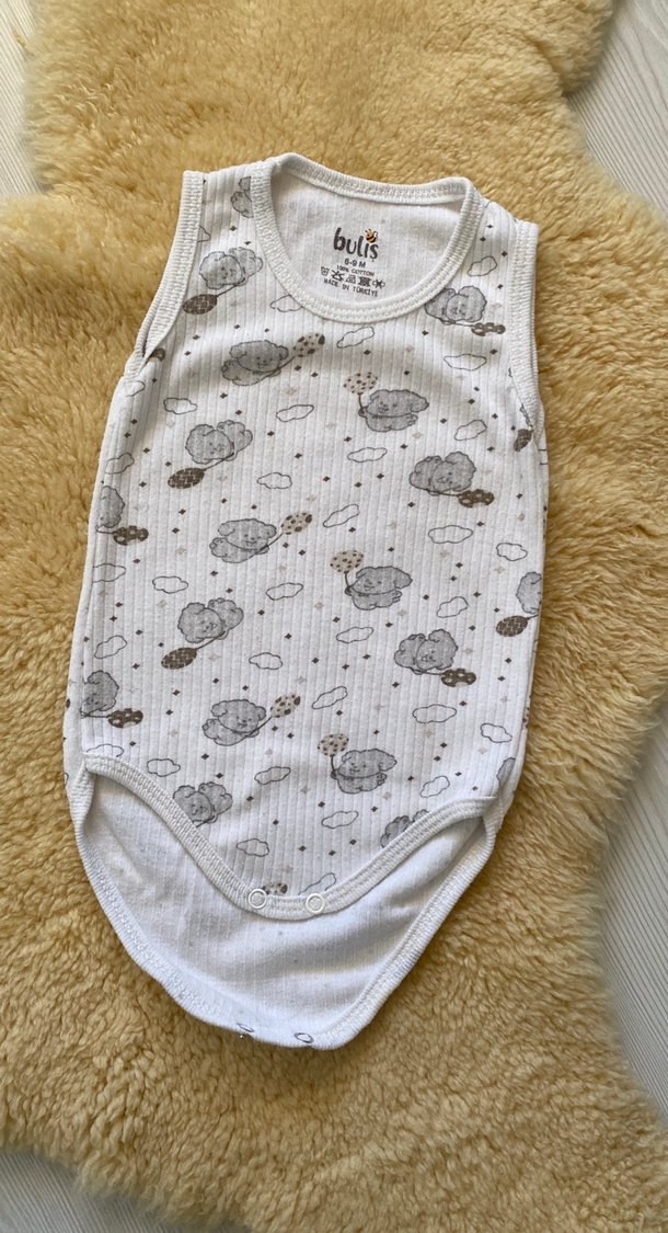 Beyaz pamuklu, bohem tarzda örgü, kolsuz ve yuvarlak yakalı bebek body. Gri bulut desenleri ve çıtçıtlı kapanış bulunur. Marka: bulis.