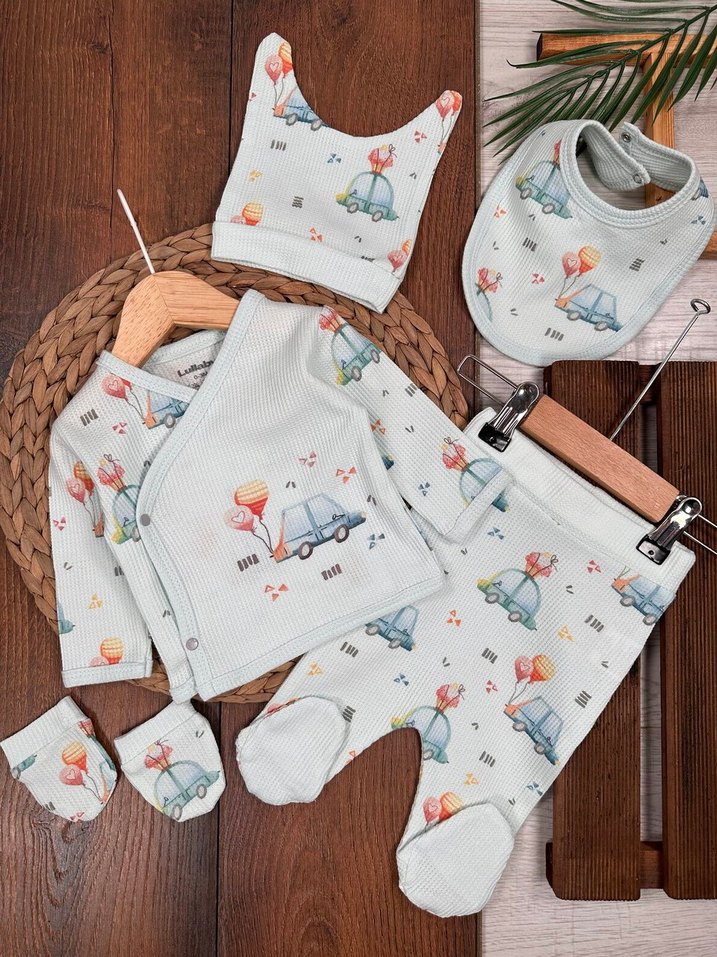 Bohem tarzı, pastel gri renkli örme bebek takımında kapüşonlu hırka, askılı üst, ayaklı pantolon, eldiven ve önlük bulunur.