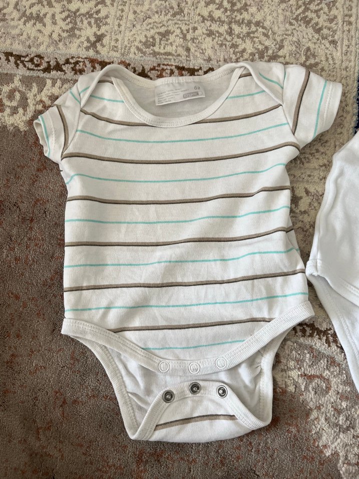 Pamuklu, kısa kollu, pastel çizgili bebek body. Yuvarlak yakalı ve kolay giyimi sağlayan çıtçıtlı tasarım. Rahat ve şık.
